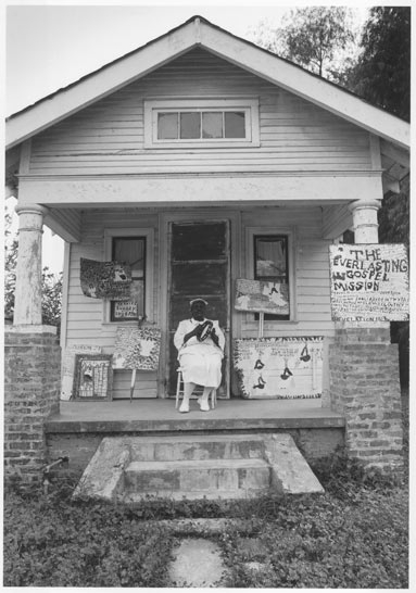 Sister Gertrude Morgan Singing and Playing the Tambourine on the Front Gallery of the Everlasting Gospel Mission, c. 1974 Joshua Horwitz (American, born 1955).Sister Gertrude was a preacher by calling. Like many of the outsider artists in the exhibit, she received directives from God to create (why hasn’t this happened to me?). Born in Alabama in 1900, Morgan was 39 years old when she was summoned to deliver God’s message to “the headquarters of sin.” That would be New Orleans, Louisiana. She left her husband behind and soon became a regular in the French Quarter, living in the Lower Ninth Ward – a neighborhood later devastated by Hurricane Katrina – until she died in 1980.