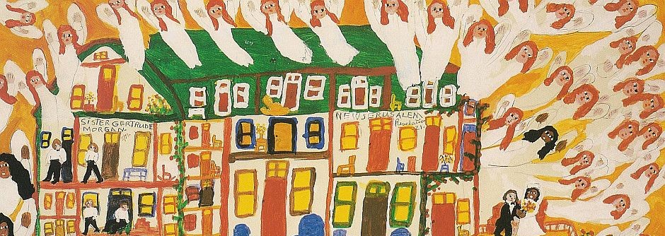 At least, that’s what I thought. A child-like painting of boxy buildings with square windows, swirling with angels in hot oranges and reds caught my eye. It was the work of street preacher Sister Gertrude Morgan. I have a book of her paintings, along with a copy of the one gospel album she recorded in the 70’s, and a remix of that record later produced by the Philadelphia-based DJ King Britt. This was the first time I ever came face to face with her paintings. A book does not compare.